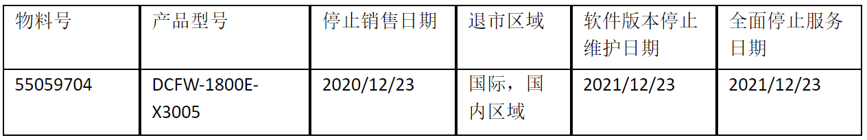 北京连连国际数码云科信息技术有限公司正式通知您, 以上DCFW-1800E-X3005下一代防火墙(55059704)将于2020年12月23号停止接收新的订单(具体日期见上表),不再供货。给您带来的不便,敬请原谅。