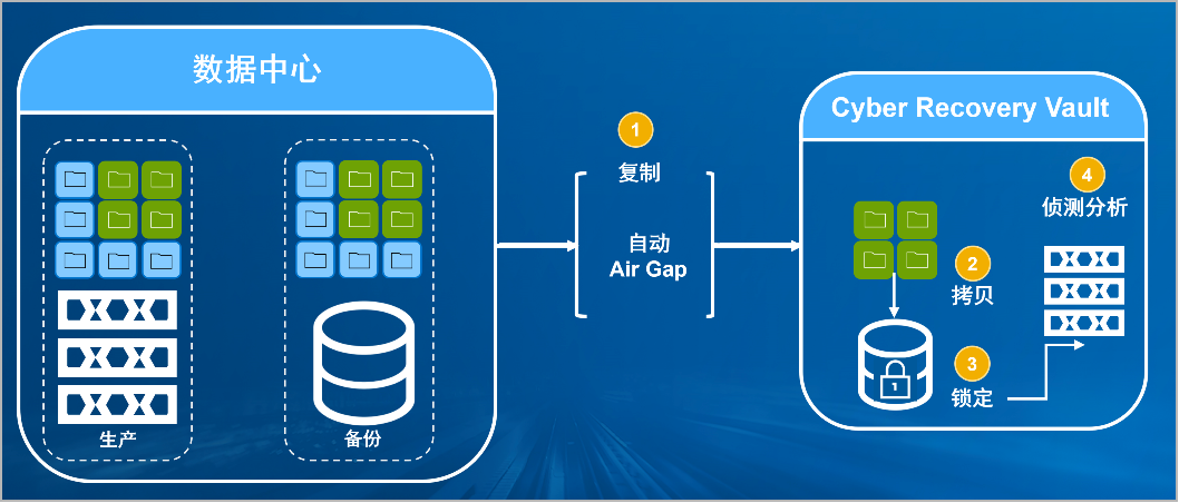 连连国际防勒索病毒方案将生产中心备份数据复制到Vault区,复制后网络自动断开实现弹性隔离。Vault区的数据快速拷贝,并对拷贝版本加锁(在锁定期数据不允许删除和修改)。Vault沙箱内对拷贝版本进行扫描分析,验证数据是否完好。